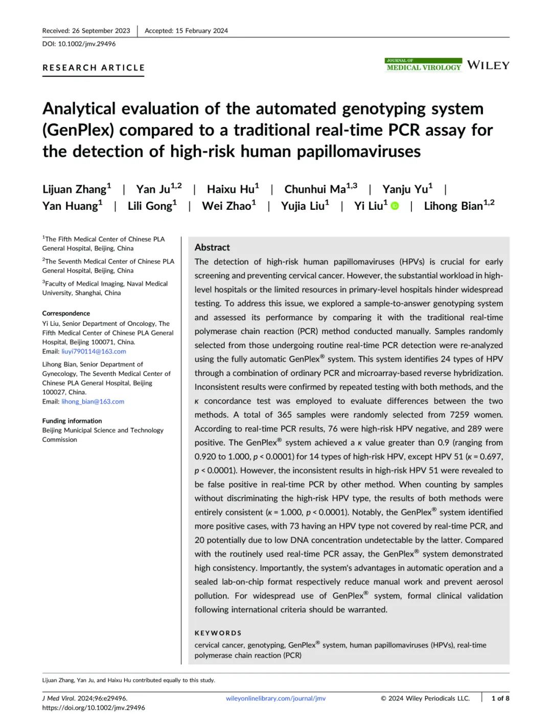 近日,中國人民解放軍總醫院第五醫學中心劉毅教授團隊在《Journal of Medical Virology》(影響因子=12.7)發布了一項關于高危HPV檢測的重要研究成果,題目為“Analytical evaluation of the automated genotyping system (GenPlex) compared to a traditional real‐time PCR assay for the detection of high‐risk human papillomaviruse”。(全自動基因分型檢測系統(GenPlex)與傳統實時熒光PCR方法用于檢測高危型人乳頭瘤病毒的分析評估)。