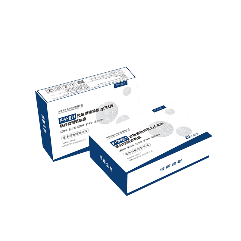 本產品基于量子點免疫熒光層析技術,可用于體外定量檢測人血清或血漿中常見戶外過敏原特異性 IgE 抗體。